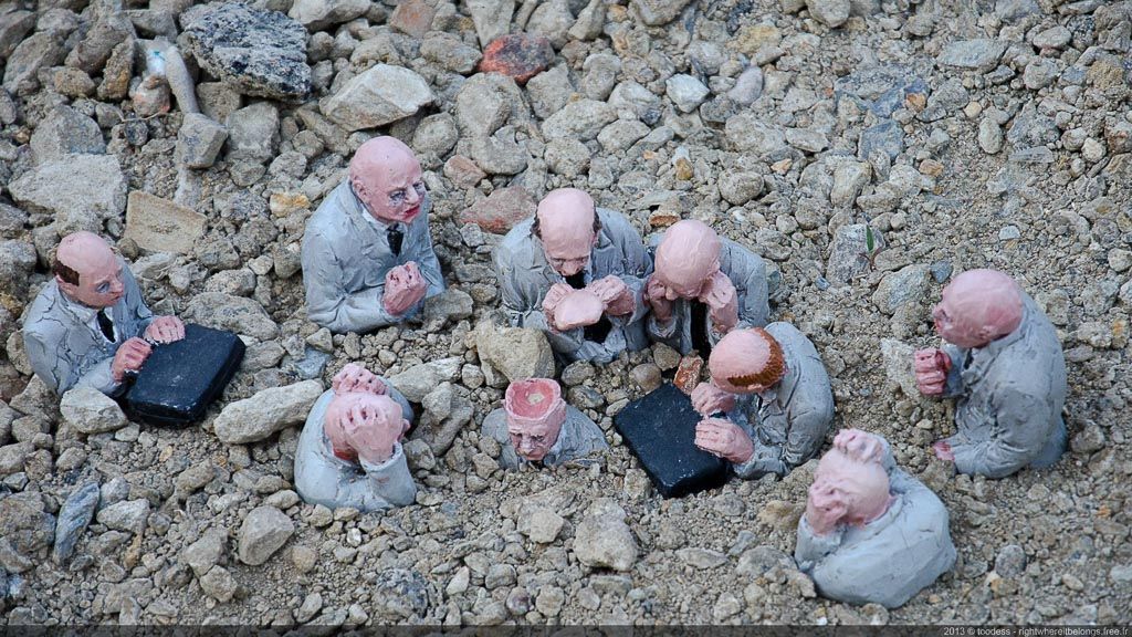 L’essentiel de la démarche d’Isaac Cordal est de provoquer le malaise ou tout du moins la réflexion en introduisant dans des lieux publics associés au divertissement ou au labeur des questions sur l’aliénation sociale, les dérives du néolibéralisme ou l’environnement. D’ailleurs la démarche du « street artist » espagnol fait penser par bien des aspects au travail d’Antony Gormley (voir notre article).